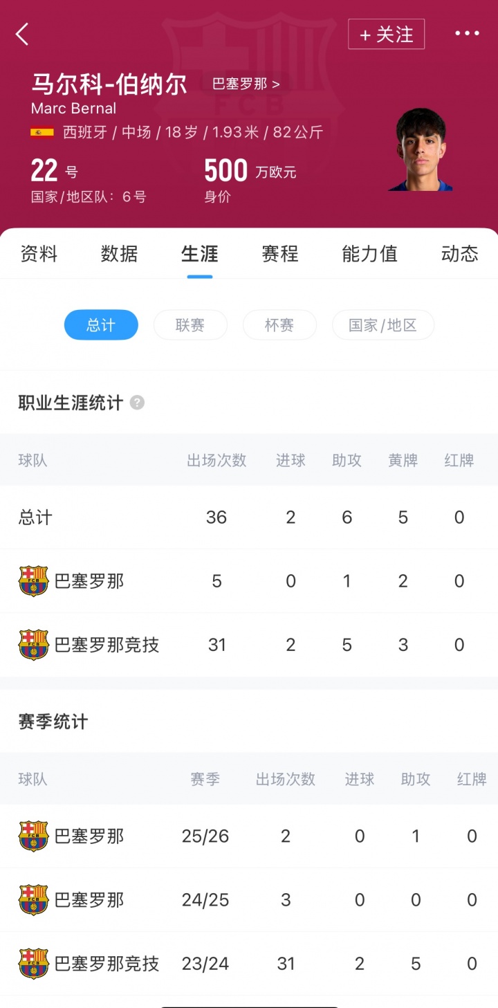 18岁的西班牙中场伯纳尔,出自巴萨拉玛西亚青训,上赛季伯纳尔遭遇十字韧带撕裂,伤缺超过1年时间。本赛季伤愈复出后,伯纳尔已经巴萨出战2场比赛,贡献1次助攻,目前伯纳尔的德转身价为500万欧元。