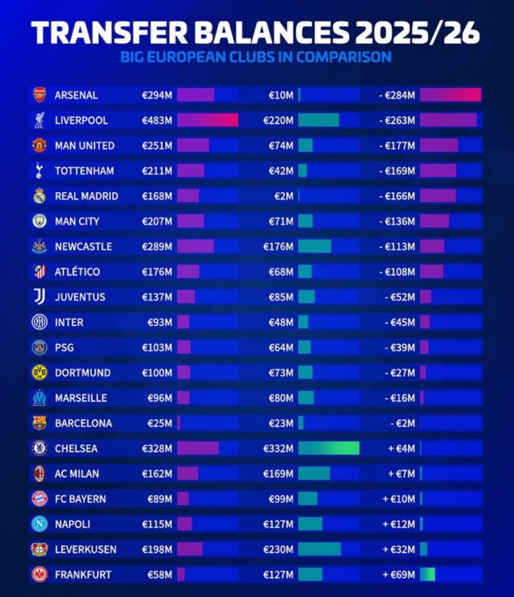 德转今夏欧洲20队转会盈亏:阿森纳净支出2.84亿,法鹰盈利6900万