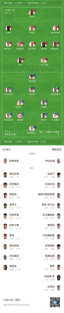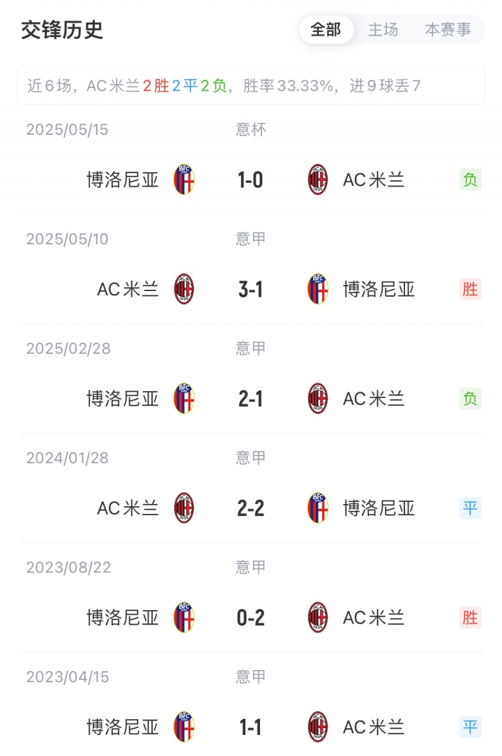 米兰开赛1胜1负积3分,博洛尼亚同样1胜1负积3分。双方近6场交锋米兰2胜2平2负,上赛季意杯决赛博洛尼亚1-0战胜米兰夺得冠军。