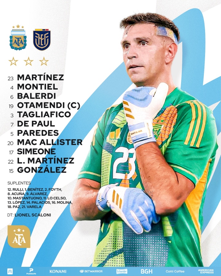 阿根廷首发:23-马丁内斯、3-塔利亚菲科、19-奥塔门迪、6-巴列尔迪、4-蒙铁尔、20-麦卡利斯特、5-帕雷德斯、7-德保罗、15-尼古拉斯-冈萨雷斯、17-朱利亚诺-西蒙尼、22-劳塔罗
